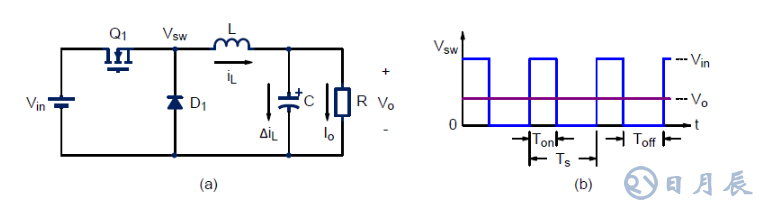 圖1. (a) 典型的 Buck 電路 (b) 開關波形