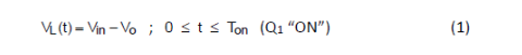 當功率開關導通 (ON) 時,加在電感上的電壓是輸入電壓和輸出電壓之間的電壓差: