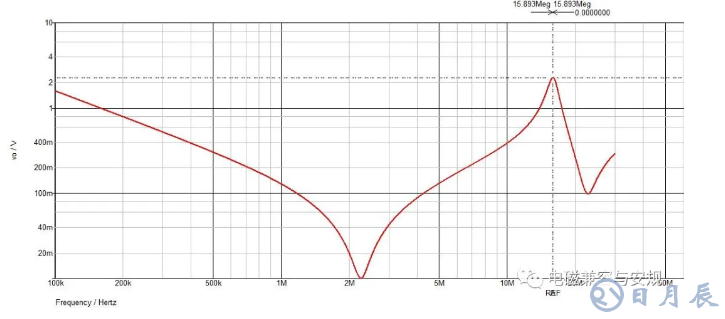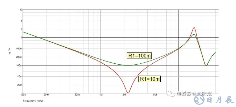 (2)增大電容的寄身電阻ESR,減小并聯(lián)諧振的品質因數(shù),如將C1電容的ESR由10m歐變?yōu)?00m歐,仿真結果如下圖所示。