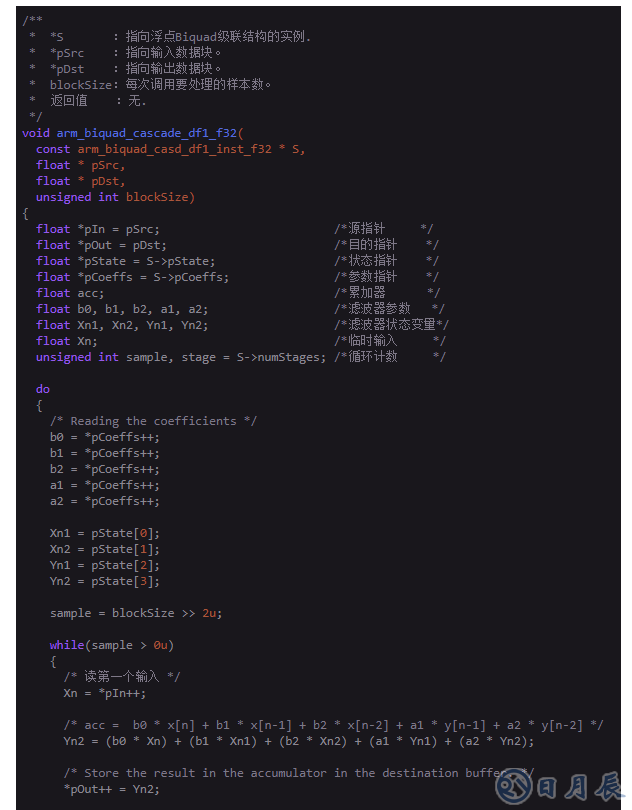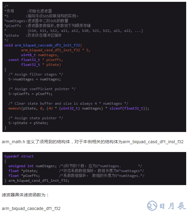 需要自己去寫前面描述的計算公式嗎?當然你也可以這么做,這里就不寫了,ARM的CMSIS庫已經(jīng)幫大家設(shè)計好了種類繁多的數(shù)字信號處理函數(shù)實現(xiàn)了,而且經(jīng)過了測試,這里直接拿來用即可。有興趣自己寫也不難,只要理解Z傳遞函數(shù)概念內(nèi)涵,非常容易實現(xiàn)。這里我們采用32位浮點實現(xiàn)函數(shù):