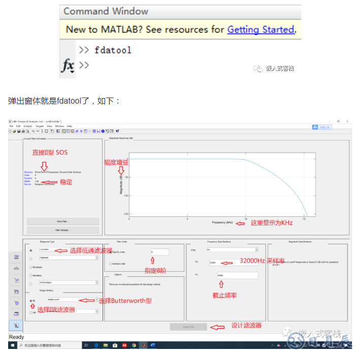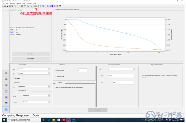 這里指定階數(shù)為8階,類型指定為巴特沃斯型IIR濾波器,輸入階數(shù)8階,采樣率32000Hz,然后點擊Design Filter如下圖所示: