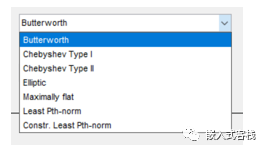 濾波器類型:這里有Butterworth(巴特沃斯)、Chebyshev Type I,Chebyshev Type II、(切比雪夫)、Elipic 等可選。