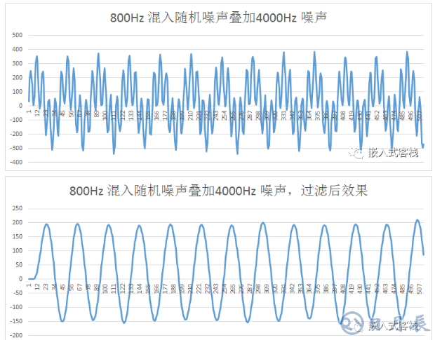 第一幅圖,為800Hz信號混入隨機噪聲的波形