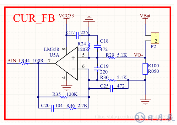 言歸正傳,單片機(jī)如何采樣電流呢?如之前所說,單片機(jī)AD模塊識別的是電壓信號,那么要采樣電流就需要先把電流信號轉(zhuǎn)換成電壓。一般的做法是在負(fù)載端增加一顆電流采樣電阻,比如選擇一個0.05Ω的電阻,當(dāng)電流為2A的時候,那么該電阻兩端的壓差就是V=IR=0.052=0.1V;這樣就可以把這個電壓信號傳送給單片機(jī)AD口進(jìn)行檢測。但是這個電壓只有0.1V,單片機(jī)AD口資源得不到充分利用,檢測誤差會很大,所以我們要把這個電壓進(jìn)行放大。能不能增大采樣電阻呢?顯然是不行的,因為增大采樣電阻會增加電路損耗。比如增加采樣電阻為1Ω,那么當(dāng)電流為2A的時候,電阻上消耗的功率為P=I2R=22*1=4W。這樣的損耗是不允許的。所以我們只能加放大器來對這個小電壓信號進(jìn)行放大。圖(2)是一個電流采樣電路,R100為電流采樣電阻,阻值0.05歐姆。該電路放大倍數(shù)為N=120K/5.1K=23.5倍。電路中使R29=R30,R24=R35,放大倍數(shù)即為N=R24/R29=R30/R35。具體原理作者將在后續(xù)文章為您分解。