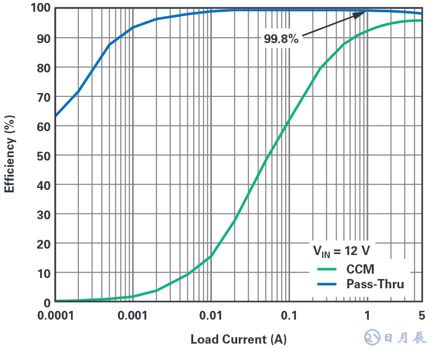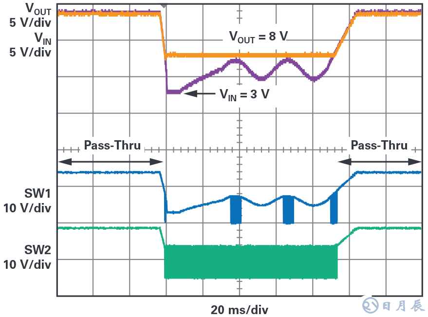 對(duì)于兩方面都想實(shí)現(xiàn)最佳效果的人來(lái)說(shuō),可以使用LT8210,它可以通過(guò)切換MODE1和MODE2引腳,在不同的工作模式之間切換。換句話說(shuō),LT8210在某些情況下可以作為具有固定輸出電壓(CCM、DCM,或Burst Mode™)的傳統(tǒng)的降壓-升壓穩(wěn)壓器運(yùn)行,然后,在應(yīng)用條件變化時(shí),轉(zhuǎn)而采用帶通模式。對(duì)于常開系統(tǒng)和啟停應(yīng)用而言,這個(gè)特性非常有用。