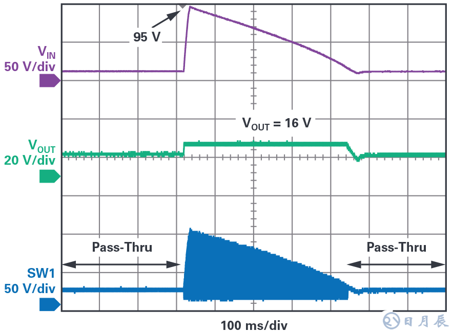 圖5.這個(gè)3 V至100 V 輸入降壓-升壓控制器以8 V至17 V帶通輸出運(yùn)行。