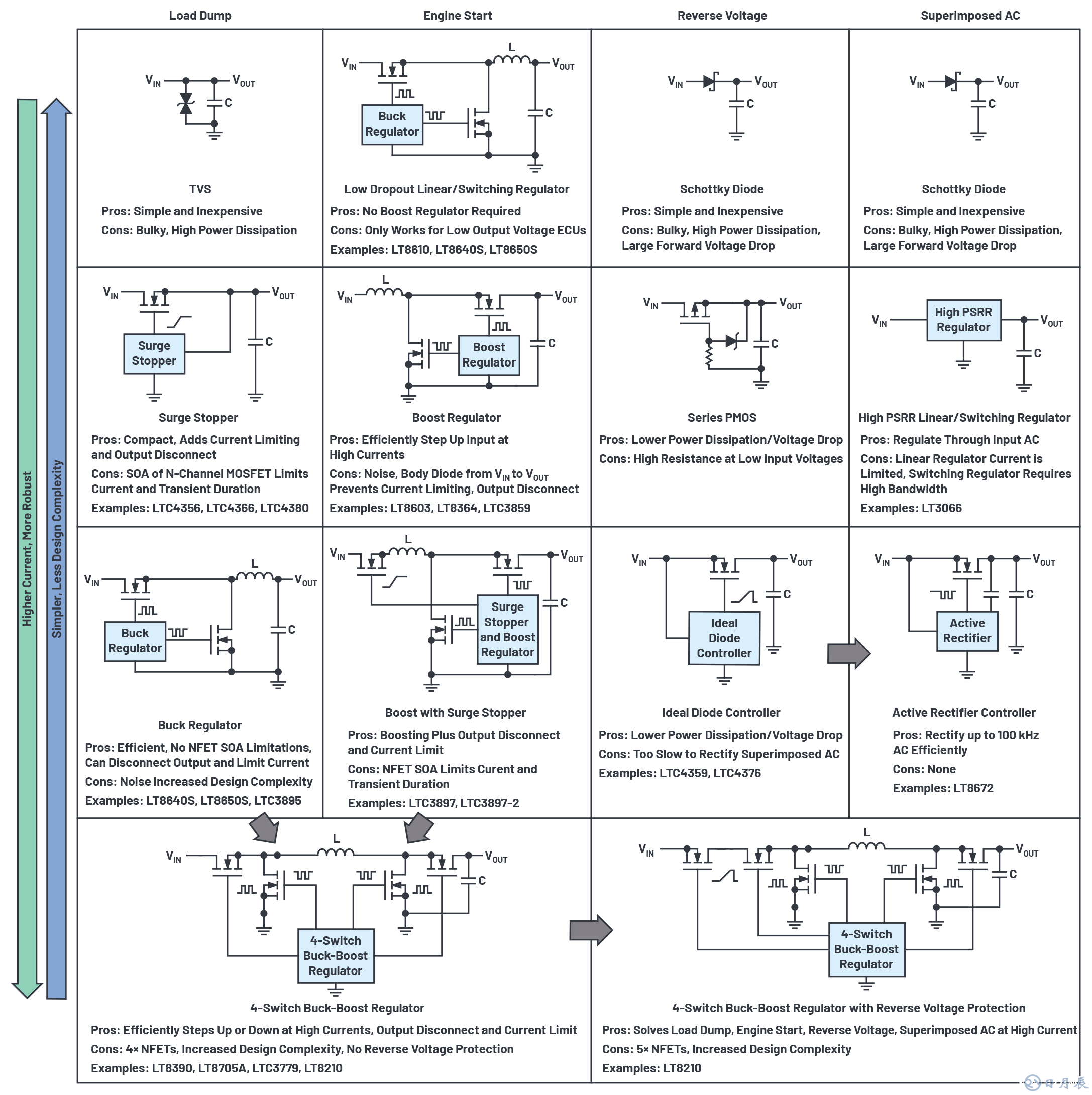 圖3匯總介紹了應(yīng)對(duì)負(fù)載突降、反向輸入電壓、疊加交變電壓和發(fā)動(dòng)機(jī)啟動(dòng)工況測(cè)試的各種解決方案,以及各種方案的優(yōu)缺點(diǎn)??梢缘贸鰩讉€(gè)關(guān)鍵結(jié)論: