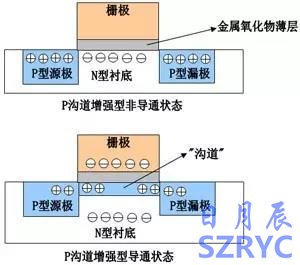 上圖僅僅是原理性的,實(shí)際的元件增加了源-漏之間跨接的保護(hù)二極管,從而區(qū)分了源極和漏極。實(shí)際的元件,p型的,襯底是接正電源的,使得柵極預(yù)先成為相對(duì)負(fù)電壓,因此p型的管子,柵極不用加負(fù)電壓了,接地就能保證導(dǎo)通。相當(dāng)于預(yù)先形成了不能導(dǎo)通的溝道,嚴(yán)格講應(yīng)該是耗盡型了。好處是明顯的,應(yīng)用時(shí)拋開了負(fù)電壓。
