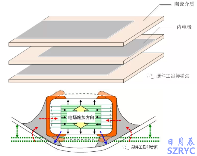 MLCC電容器發(fā)生嘯叫主要是由陶瓷的壓電效應(yīng)引起的,MLCC電容器由于其特殊的結(jié)構(gòu),當(dāng)施加在兩端的電場變換時(shí),可以引起成比例的機(jī)械應(yīng)力的變化,此為逆壓電效應(yīng),當(dāng)振動(dòng)頻率落入人耳聽覺范圍內(nèi)時(shí),就會(huì)產(chǎn)生噪音,即所謂的“嘯叫”。正壓電效應(yīng)相反,是受到力的作用,產(chǎn)生電場的過程。