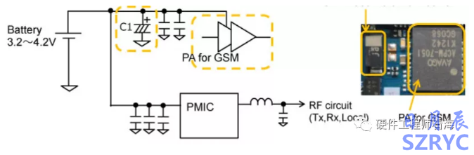 在手機(jī)中,最典型的一個(gè)案例是GSM所用的PA電源,此電源線上的特點(diǎn)是功率波動(dòng)大、波動(dòng)頻率為典型的217Hz,落入人耳聽覺范圍內(nèi)(20Hz~20Khz),當(dāng)GSM通話時(shí),用專用聽診器聽此電源線上的電容,很容易聽到“滋滋”嘯叫音。