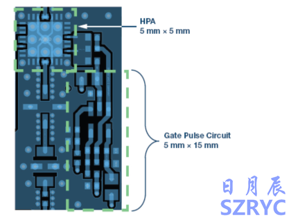 對(duì)一個(gè)代表性布局做了尺寸研究,如圖6所示。柵極脈沖電路的運(yùn)算放大器部分放置在通向HPA輸入的RF路徑附近。精密DAC未顯示出來(lái),假定其放置在控制部分中,為多個(gè)發(fā)射通道提供輸入。布局研究表明,可將該電路添加到實(shí)際的低成本PWB實(shí)現(xiàn)方案中,發(fā)射RF電路所需的額外空間極小。