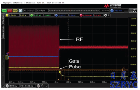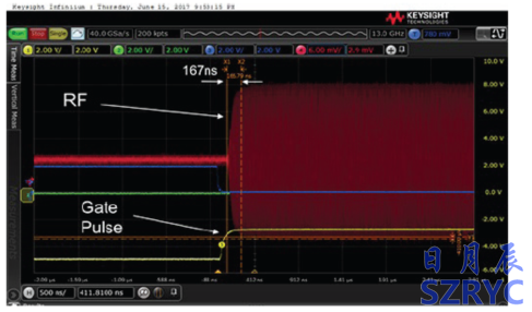 實(shí)測(cè)開(kāi)啟時(shí)間如圖4所示。時(shí)間標(biāo)度為每格500 ns,RF信號(hào)的上升時(shí)間小于200 ns。對(duì)于測(cè)量從柵極脈沖開(kāi)始到RF脈沖上升沿結(jié)束的時(shí)間的系統(tǒng),可以看到開(kāi)啟時(shí)間約為300 ns,這說(shuō)明系統(tǒng)分配1 μs用于發(fā)射到接收轉(zhuǎn)換會(huì)有相當(dāng)可觀的裕量。