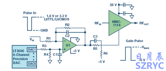 用于驗(yàn)證電路的測(cè)試設(shè)置如圖3所示。對(duì)精密DAC、運(yùn)算放大器和HPA使用評(píng)估板。一個(gè)脈沖發(fā)生器用于模擬1.8 V邏輯信號(hào)。信號(hào)發(fā)生器連續(xù)工作,利用一個(gè)輸入帶寬高于RF頻率的RF采樣示波器測(cè)量HPA對(duì)RF信號(hào)的開(kāi)啟/關(guān)閉。