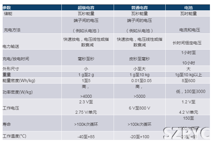 另一方面,電池可以儲存大量能量,但在功率密度和輸送方面有局限性。電池內(nèi)部會發(fā)生化學(xué)反應(yīng),故其充電循環(huán)次數(shù)很有限。因此,如果要在較長時間里輸送適量功率,那么電池最有效,而讓電池非常迅速地輸出大電流,則會嚴(yán)重縮短其有效使用壽命。表1總結(jié)了超級電容、普通電容和電池的優(yōu)缺點(diǎn)。
