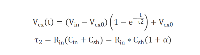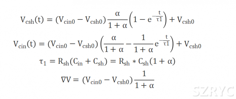 此時,等效電容為輸入電容和采樣電容并聯(lián),根據(jù)以上模型,可以大致推導(dǎo)出輸入電壓和采樣電壓對應(yīng)方程如下: