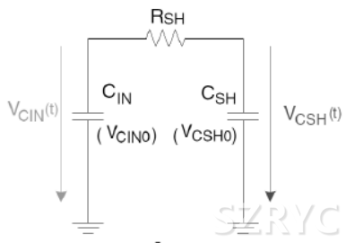 按照正常采樣,第二階段采樣時間必須要滿足輸入電阻、輸入電容和采樣電容并聯(lián)的乘積關(guān)系。如果采樣不足,又會出現(xiàn)怎樣的情況呢?在采樣開關(guān)斷開之后,采樣保持階段,由于Cx變小,輸入電容充電速度明顯加快,此時,Csh電壓幾乎不變,大致波形應(yīng)如下(具體推導(dǎo)公式不再列出):