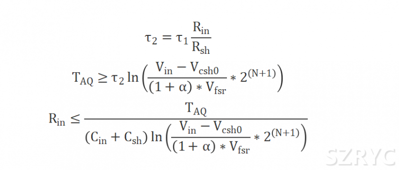 根據(jù)ADC內(nèi)部結(jié)構(gòu)和,我們可以很輕松的推導(dǎo)出,第二階段的時間遠遠大于第一階段的時間,同時,我們也可以推導(dǎo)出,采樣時間和輸入電阻必須滿足: