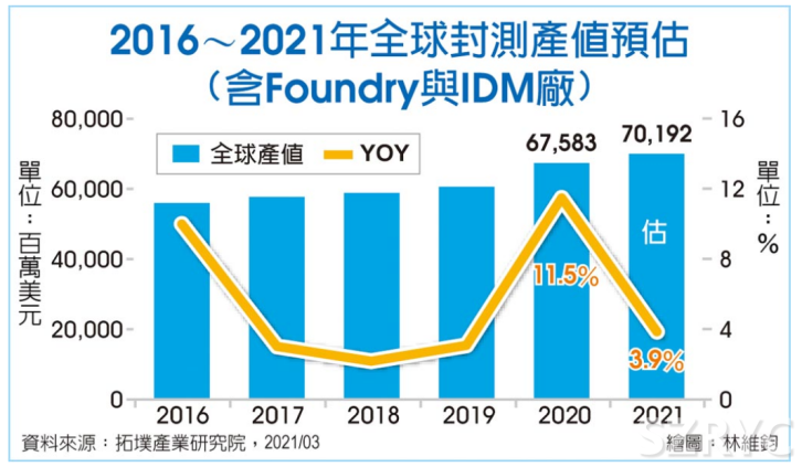 (2016~2021年中國封測產(chǎn)值預(yù)估)