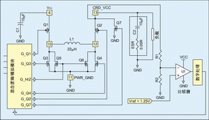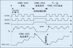 周期2:Q2及Q3開通,且存儲(chǔ)在電感L1中的能量通過Q2轉(zhuǎn)移到外接負(fù)載。在此階段,Q1/Q4及Q5/Q6關(guān)斷。電流流通周期是900ns恒定值(典型值),如果CRD_VCC電壓低于規(guī)定值,在這段時(shí)間以后重復(fù)周期1。