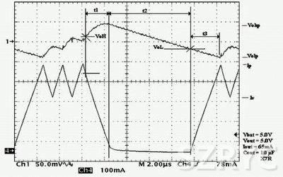 令k=R1/(R1+R2)。當(dāng)Vo大于k*Vref時(shí),內(nèi)部比較器U1翻轉(zhuǎn),在時(shí)間t1輸出電流降為零。相應(yīng)的,輸出電容中載有之前存儲(chǔ)在電感中的全部能量,而且輸出電壓保持增加到參數(shù)k*Vref規(guī)定的參考值以上。最終電壓Vohp代表高端紋波幅度。
