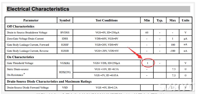 ▲舉例:其中一個廠家生產(chǎn)的2N7002的數(shù)據(jù)手冊,Vgs的開啟電壓為1V