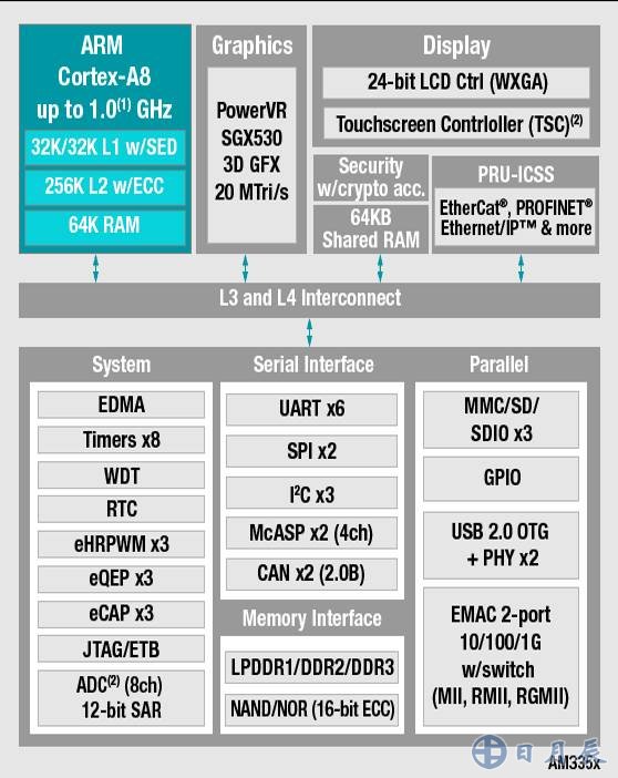 AM335x 微處理器為基于ARM Cortex-A8 處理器,在圖像、圖形處理、外設(shè)以及 EtherCAT 和 PROFIBUS等工業(yè)接口選項(xiàng)方面得到了增強(qiáng)。800MHz主頻的Cortex -A8內(nèi)核能遠(yuǎn)強(qiáng)于ARM9,可提供快速的數(shù)據(jù)處理和流暢的界面切換。