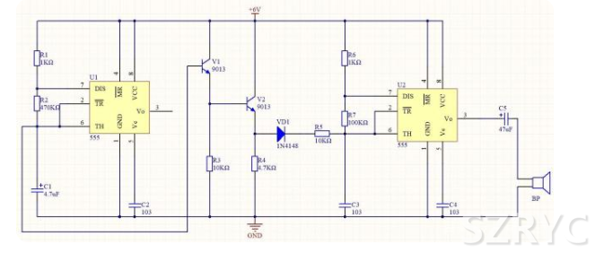 這個防盜門報警器電路圖是由555芯片組成的模擬汽笛聲的一種報警器;大家可以參考。