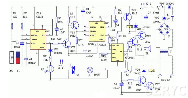 這個電路相對比較復(fù)雜,電路由觸發(fā)裝置、單穩(wěn)態(tài)延時電路、報警聲發(fā)生器、音頻功放電路、燈光控制電路、預(yù)置封鎖電路和電源電路等部分組成。