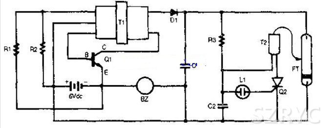 BZ:金屬蜂鳴器 C1:5UF電容器 C2:電容器 D1:IN4007二極管 FT:微型閃光燈 L1:氖燈 Q1:三極管 Q2:可控硅整流器 R1:200Ω電阻 R2:820Ω電阻 R3:10M電阻器 T1:反向變壓器 T2:4kv觸發(fā)線圈