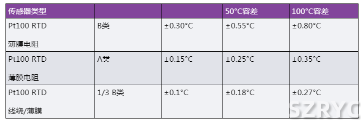 表2.RTD精度—A類、B類、1/3 DIN