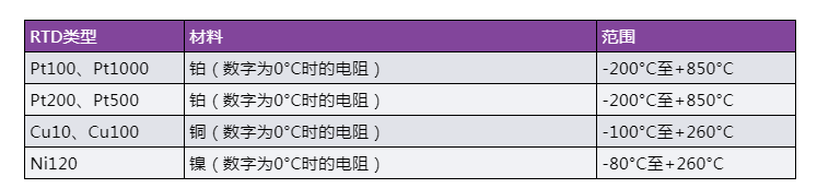 表1.常見RTD類型