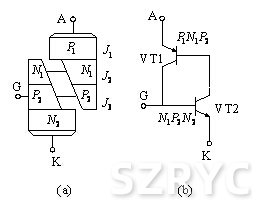 根據(jù)晶閘管的內(nèi)部結(jié)構(gòu),可以把它等效地看成是兩只晶體管的組合,其中,一只為pnp型晶體管vt1,另一只為npn型晶體管vt2,中間的pn結(jié)為兩管共用,如圖所示。