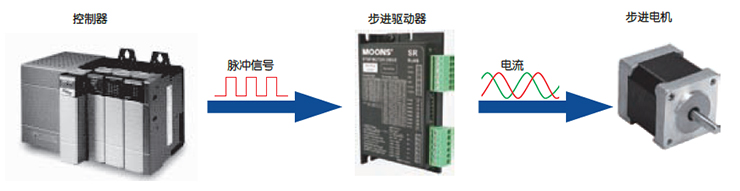 步進電機以一個固定的步距角轉(zhuǎn)動,就像時鐘內(nèi)的秒針。這個角度稱為基本步距角。鳴志提供兩種基本步距角來作為標準電機:基本步距角為1.8°的兩相步進電機和基本步距角為1.2°的三相步進電機。 • 簡單的脈沖信號控制需高精度定位的系統(tǒng)如下所示??刂破靼l(fā)出的脈沖信號可以準確地控制步進電機的轉(zhuǎn)動角度和速度。 |