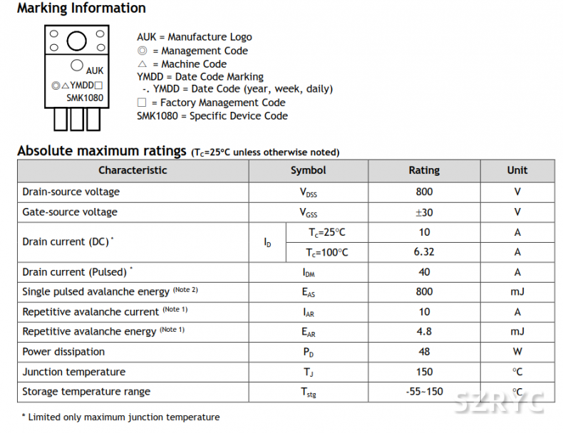 SMK1080FD韓國AUK高壓MOS管詳細(xì)參數(shù),10A800V TO-220F MOS管,內(nèi)阻0.93歐