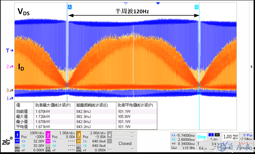 對于普通 MOS 管來說,不同周期的電壓和電流波形幾乎完全相同,因此整體功率損耗只需要任意測量一個周期即可。但對于 PFC MOS 管來說,不同周期的電壓和電流波形都不相同,因此功率損耗的準確評估依賴較長時間(一般大于 10ms),較高采樣率(推薦 1G 采樣率)的波形捕獲,此時需要的存儲深度推薦在 10M 以上,并且要求所有原始數(shù)據(jù)(不能抽樣)都要參與功率損耗計算,實測截圖如圖 3所示。