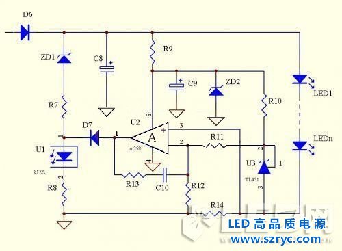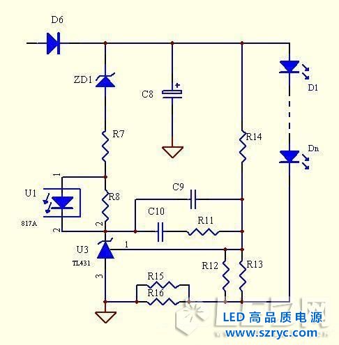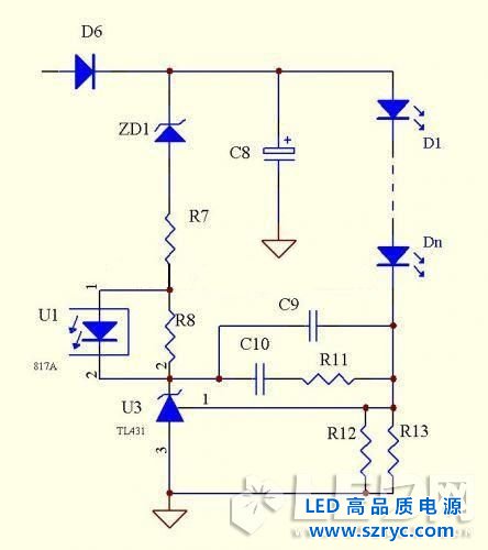 原理:此電路同樣是利用了TL431的2.495V的基準(zhǔn)來做恒流,跟上面的電路不同點(diǎn)在于減少了電流取樣電路的電壓,只要合計(jì)設(shè)計(jì)R12,R13,R14的值,可以限制LED上面的壓降.