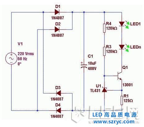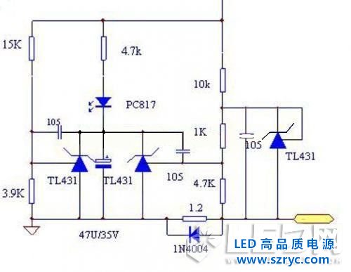 如上圖,即是利用單個(gè)TL431恒流的改進(jìn)型示意圖