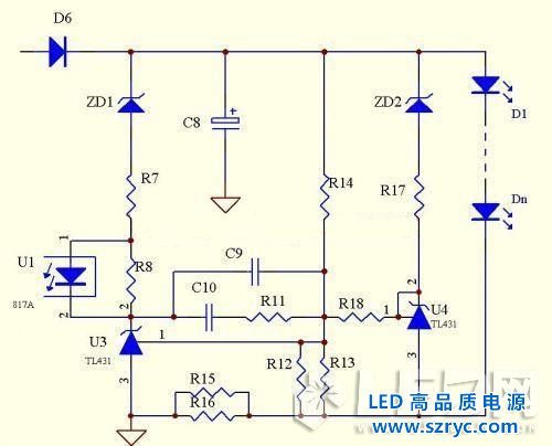 由于TL431是2.5V基準(zhǔn),故恒流取樣電路的損耗極大,不適合做輸出電流過大的電源。而此電路的致命缺陷是不能空載,故不適合做外置式的LED電源,所以下面我們對線路的一些缺陷進(jìn)行了改進(jìn)。