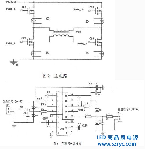 半橋和全橋是開關(guān)電源常用的拓?fù)浣Y(jié)構(gòu),“直通”對其有很大的威脅,直通是同一橋臂兩只晶體管在同一時間內(nèi)同時導(dǎo)通的現(xiàn)象。在換流期,開關(guān)電源易受干擾而造成直通,過大的直通電流會損壞用于逆變的電力電子器件。一旦出現(xiàn)直通現(xiàn)象,須盡快檢測到并立即關(guān)斷驅(qū)動,以避免開關(guān)器件的PN結(jié)積累過大的熱量而燒壞。這里利用雙單穩(wěn)態(tài)集成觸發(fā)器CD4528設(shè)計(jì)了一種針對全橋和半橋的直通檢測、保護(hù)電路。