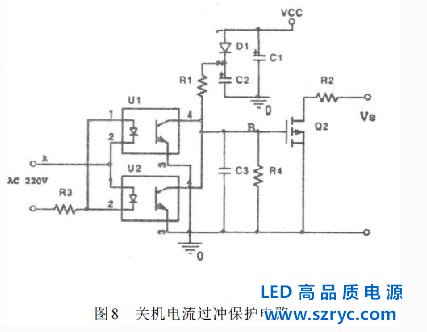 圖8 為關(guān)機(jī)電流過沖保護(hù)電路,該電路能在3ms內(nèi)迅速檢測出交流電源是否關(guān)閉,并且在電源關(guān)閉后強(qiáng)行將調(diào)節(jié)器給定輸入端的電壓拉低,防止電流過沖,具體動作過程如下。