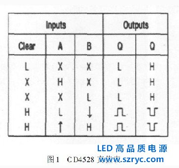 CD4528含兩個單穩(wěn)態(tài)觸發(fā)器,其真值表如圖1.芯片3腳與13腳分別為其內(nèi)部兩個獨(dú)立單穩(wěn)態(tài)電路的Clear端,5腳和11腳為單穩(wěn)態(tài)的B輸入端,4腳與12腳為單穩(wěn)態(tài)的A輸入端。B端接高電平,只有當(dāng)Clear端為高電平時,A端輸入的上升沿觸發(fā)才會有效。