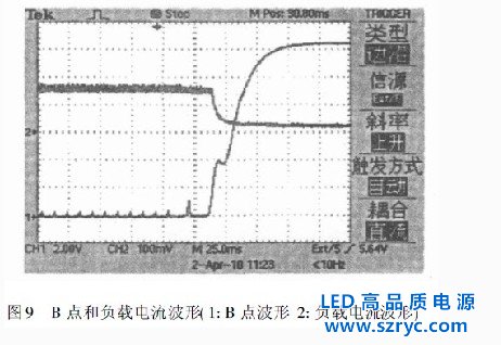光耦U1、U 2 隨被測電源的正負(fù)半周交替導(dǎo)通,當(dāng)A 點(diǎn)交流電壓大于光耦中發(fā)光二極管的導(dǎo)通電壓Von時,光耦開啟,C3通過光耦中三極管放電,使B 點(diǎn)的電壓達(dá)不到場效應(yīng)管的開啟電壓; 當(dāng)交流電壓小于Von時,光耦不導(dǎo)通,C3充電,B點(diǎn)的電壓增加,此時應(yīng)使C3的電壓上升到場效應(yīng)管閾值的時間大于光耦關(guān)閉的時間,以保證Q2不導(dǎo)通。 在t1時刻交流電源斷開,光耦輸出呈高阻態(tài),C2中存儲的電荷經(jīng)R1向C3充電,C3上的電壓迅速增加,當(dāng)B點(diǎn)電壓大于場效應(yīng)管的開啟電壓時,場效應(yīng)管Q2導(dǎo)通,導(dǎo)通后可迅速將Vs 拉低,圖8中Vs是調(diào)節(jié)器的給定輸入端電壓。 關(guān)機(jī)瞬間負(fù)載電流和圖8中B點(diǎn)的波形如圖9.改變R1和R4的參數(shù),可以改變給C3充電的時間。 R4選用較大阻值的,可以提高C3上的電壓,同時延長C3的放電時間。 C2的大小可以決定交流電源斷電后維持該電路工作的時間。 綜上所述,設(shè)置合理的參數(shù),便可保證在主電路電源沒有完全關(guān)閉的情況下,Q2一直導(dǎo)通,即誤差放大器的給定輸入端一直為零,避免了電流過沖。