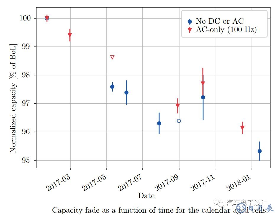 這個(gè)實(shí)驗(yàn)經(jīng)歷了一年的測(cè)試周期,大約2000次循環(huán),大約損失了原始容量的約20%。容量衰減量與是否疊加紋波電流(交流頻率)無(wú)關(guān)