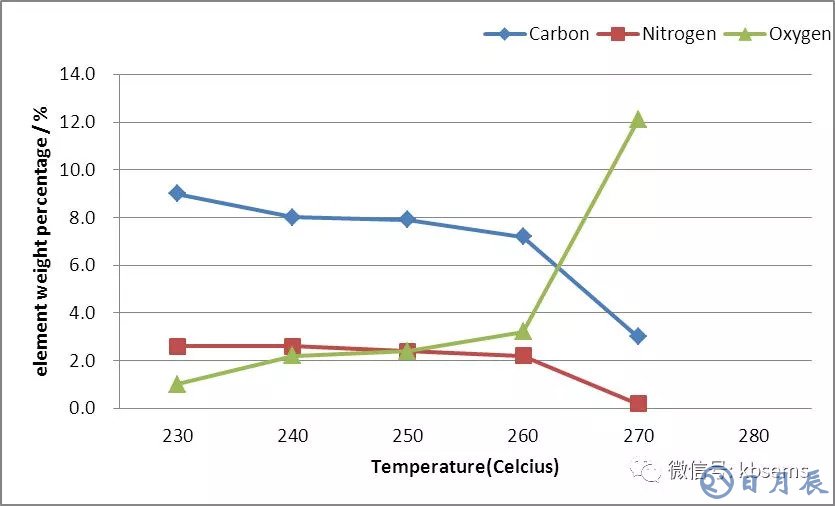 當(dāng)溫度達到270℃時,棕化層最終失效,棕化層成分隨溫度變化而變化的比例如圖6所示:[2]