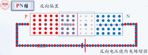 如果加個(gè)反向的電壓呢?從P型半導(dǎo)體那里再抽電子到N型半導(dǎo)體,而N型早已掛滿了額外的電子,多出來的電子不斷增強(qiáng)電場,直至抵消外加的電壓,電子就不再繼續(xù)移動(dòng),此時(shí)PN結(jié)就是不導(dǎo)電的。
