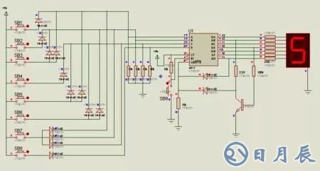 左邊有8個(gè)輸入端,右邊有7個(gè)輸出端,每個(gè)輸出端對應(yīng)一個(gè)發(fā)光管。從左邊輸入一串信號:00000101,經(jīng)過中間一堆的電路,使得右邊輸出另一串信號:1011011。