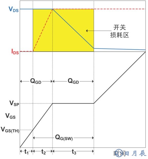 1、在時(shí)間段t1開(kāi)始時(shí),當(dāng)MOSFET驅(qū)動(dòng)器開(kāi)始向MOSFET的柵極提供電流時(shí),VGS(MOSFET 的柵 - 源電壓)開(kāi)始上升。在此期間,將對(duì)輸入電容 Ciss(CGS + CGD)進(jìn)行充電,而 VDS(MOSFET 的漏 - 源電壓)保持恒定。此時(shí)不存在漏 - 源電流,因此,在此期間沒(méi)有開(kāi)關(guān)損耗。==>VGS小于閾值,MOSFET未開(kāi)啟,無(wú)損耗。
