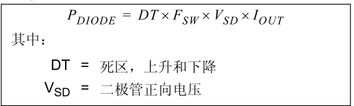 4)、當(dāng)同步降壓轉(zhuǎn)換器中的兩個(gè)開(kāi)關(guān)均關(guān)閉時(shí),下橋臂 MOSFET 的體二極管將開(kāi)啟。在此期間(稱(chēng)為死區(qū)(Dead Time,DT)),體二極管中將出現(xiàn)傳導(dǎo)損耗。這些損耗可以描述為: