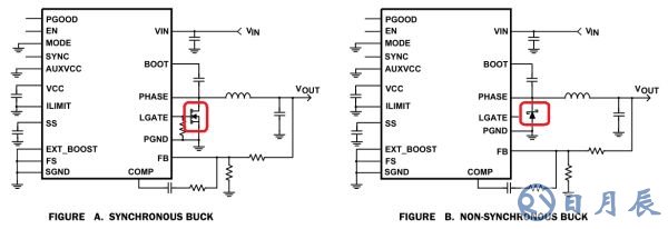 在BUCK電路的技術(shù)演變過(guò)程中出現(xiàn)了兩個(gè)小分支,同步Buck與非同步Buck。兩者的外觀(guān)差異明顯很好區(qū)分,有上下兩個(gè)MOSFET管的Buck叫同步Buck;只有上管MOSFET,續(xù)流管是肖特基二極管的Buck叫做非同步Buck。同步Buck是后面發(fā)展出來(lái)的技術(shù),使用MOSFET來(lái)代替續(xù)流二極管降低了導(dǎo)通壓降,所以提升了電源效率,當(dāng)然需要額外增加一套MOSFET驅(qū)動(dòng)電路成本有所上升。