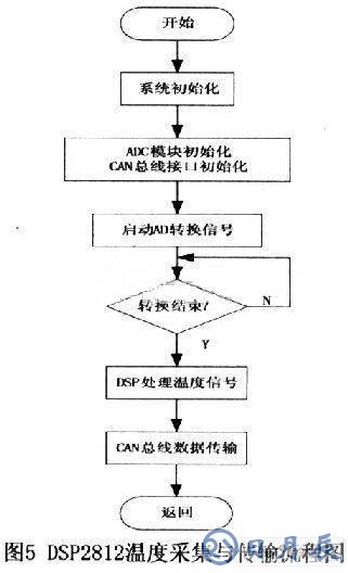 系統(tǒng)主站主要完成遠(yuǎn)程監(jiān)控與數(shù)據(jù)存儲、打印、顯示,與下位機通訊顯示輸送機溫度,轉(zhuǎn)送,故障報警等功能?,F(xiàn)場DSP程序主要包括兩部分功能:溫度檢測 ADC轉(zhuǎn)換與CAN總線通信。DSP2812溫度采集與傳輸流程圖如圖5所示。CAN總線通信時各智能節(jié)點通過CAN總線不斷向上位機發(fā)送測試數(shù)據(jù),上位機通過指令方式設(shè)置溫度上下限并對報警溫度做出處理。